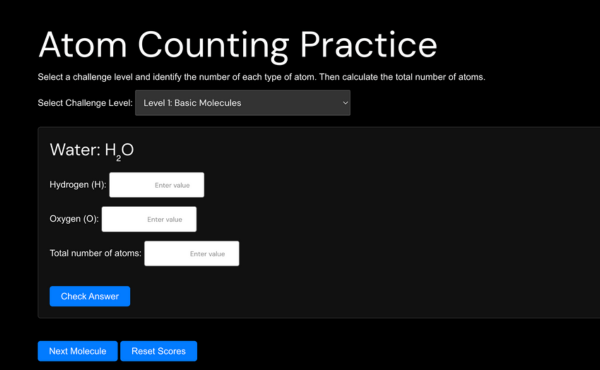 Students practice counting atoms in chemical formulas across varying difficulty levels, reinforcing their understanding of molecular composition and atomic symbols, with a fun challenge scoring system to track their progress.