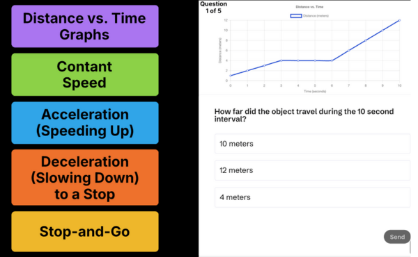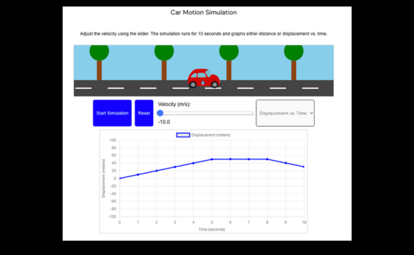 This interactive simulation lets users explore how velocity affects motion by comparing distance and displacement over time. As the car moves, it generates real-time graphs showing either total distance traveled or overall displacement, helping students understand the difference between these two concepts.