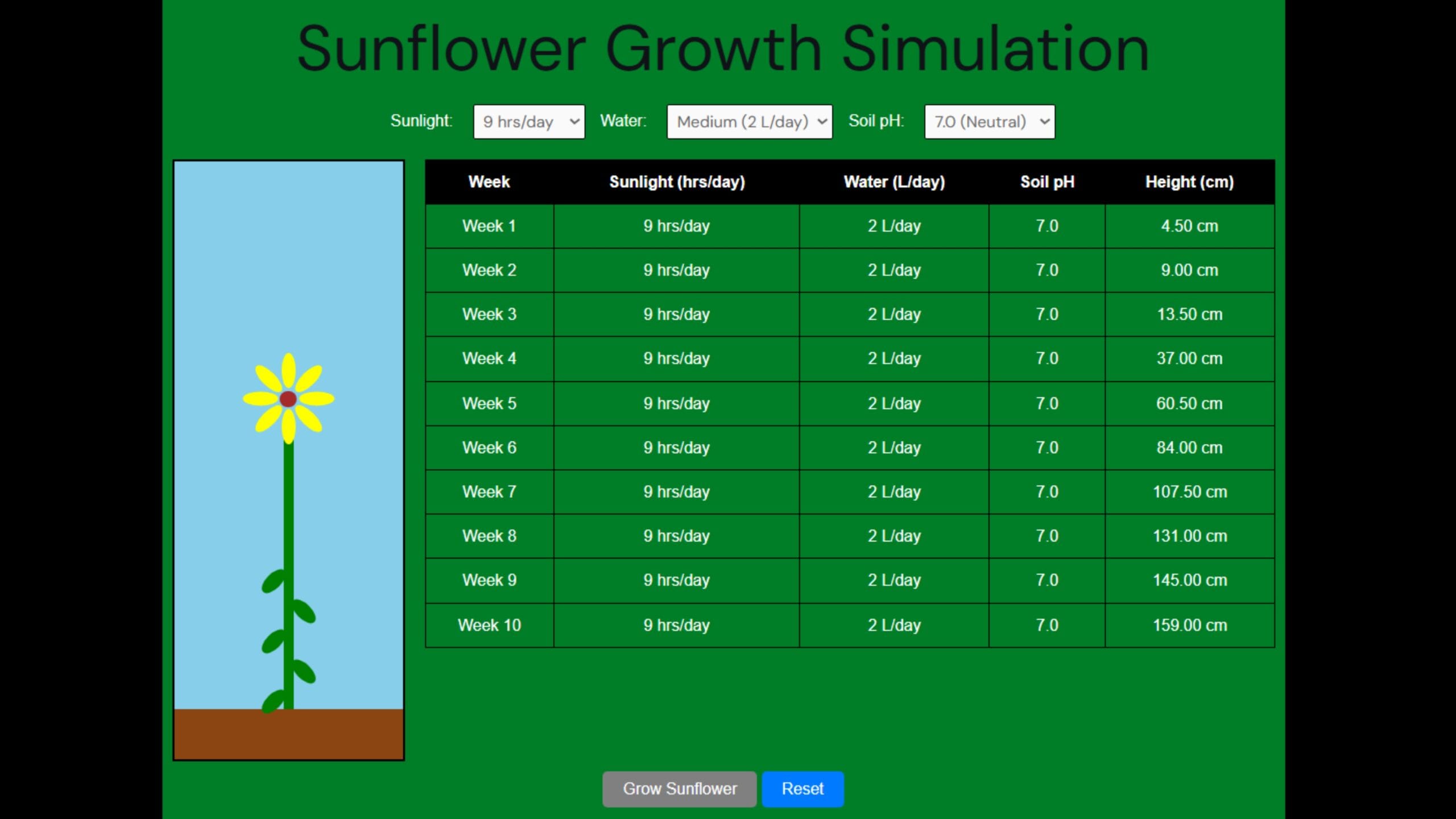 Use a simulation to practice designing and carrying out a science investigation by changing one variable at a time to explore how sunlight, water, or soil pH affects the growth of a sunflower plant.